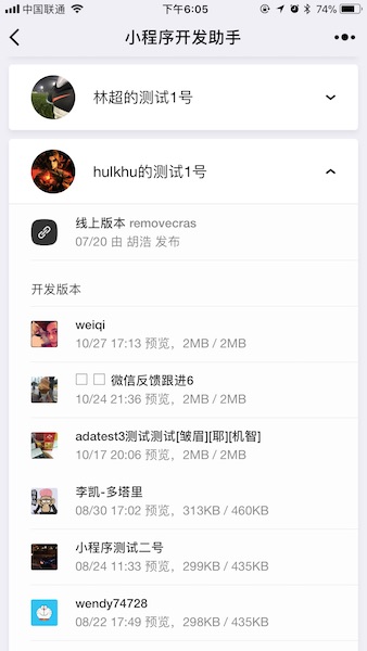 使用者可以在小程序开发助手查看和预览与自己关联的所有小程序。小程序将会按照其更新时间自动排序,显示在最上面的小程序是最近有提交的小程序,例如开发者预览了新的代码,或者体验版有更新。