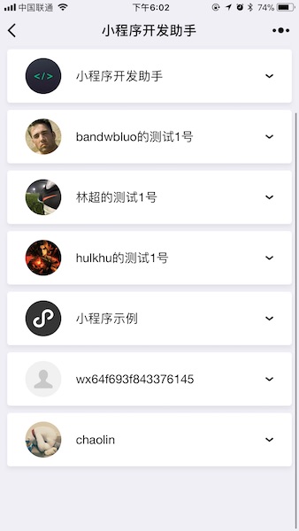 通过点击并展开小程序列表,使用者可以根据自己的身份,浏览到小程序的线上版本、体验版本或开发版本。如果使用者是小程序的管理者,可以浏览到全部三种版本;如果使用者身份是 “体验者”,则可以浏览到线上版本、体验版本,而不会浏览到任何开发版本。