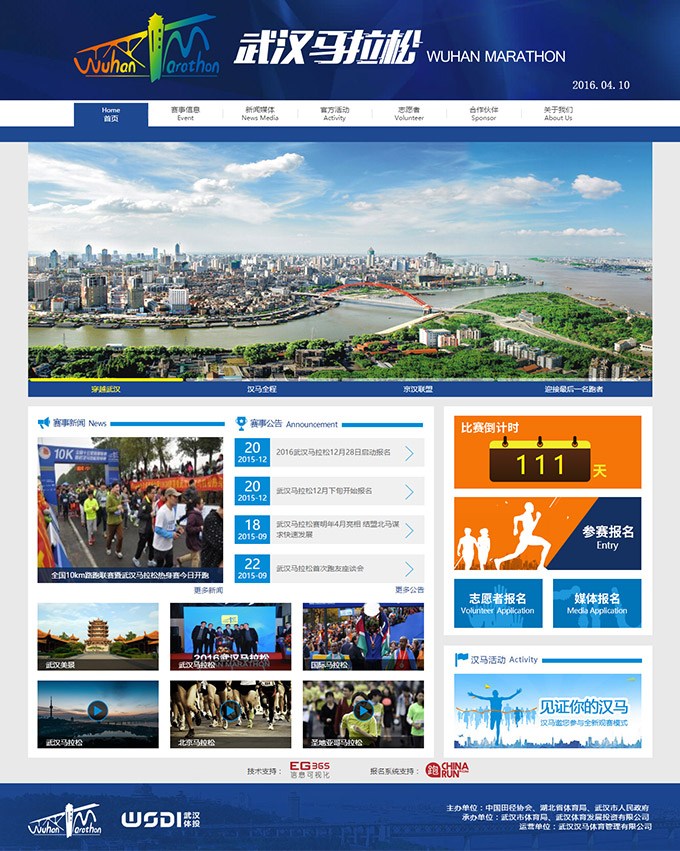首届武汉马拉松赛将于2016年4月10日举行,赛事设马拉松、半程马拉松、健康跑(12公里)3个项目,参赛总规模为2万人。其中,全马项目限报6000人,半程马拉松限报6000人,健康跑限报8000人。如报名人数超出名额,选手参赛资格将采取抽签办法获取。在20日上午举行的发布会上,武汉市体育局揭晓了汉马Logo,Logo设计以武汉长江大桥为设计原型 ,体现了联接,沟通,跨越的内涵。 此次设计来源社会征集,网上投票,专家复审,最后确定。