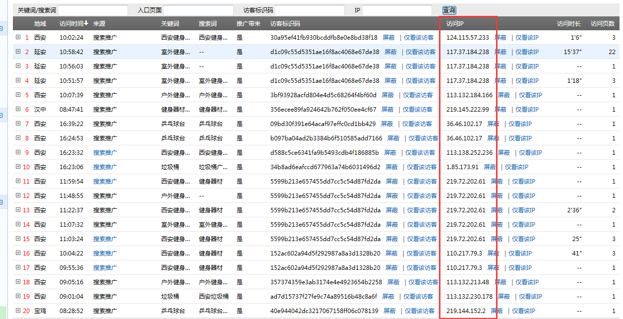 二、商盾使用之前:同一IP多次点击客户广告,也没有什么好办法控制访客的点击次数,导致消费太快,下线过早。如下图所示:“111.155.10.200”这一IP地址多次点击同一客户广告,如果不进行手动屏蔽,则客户的预算就被无效点击完了,何谈转化?
