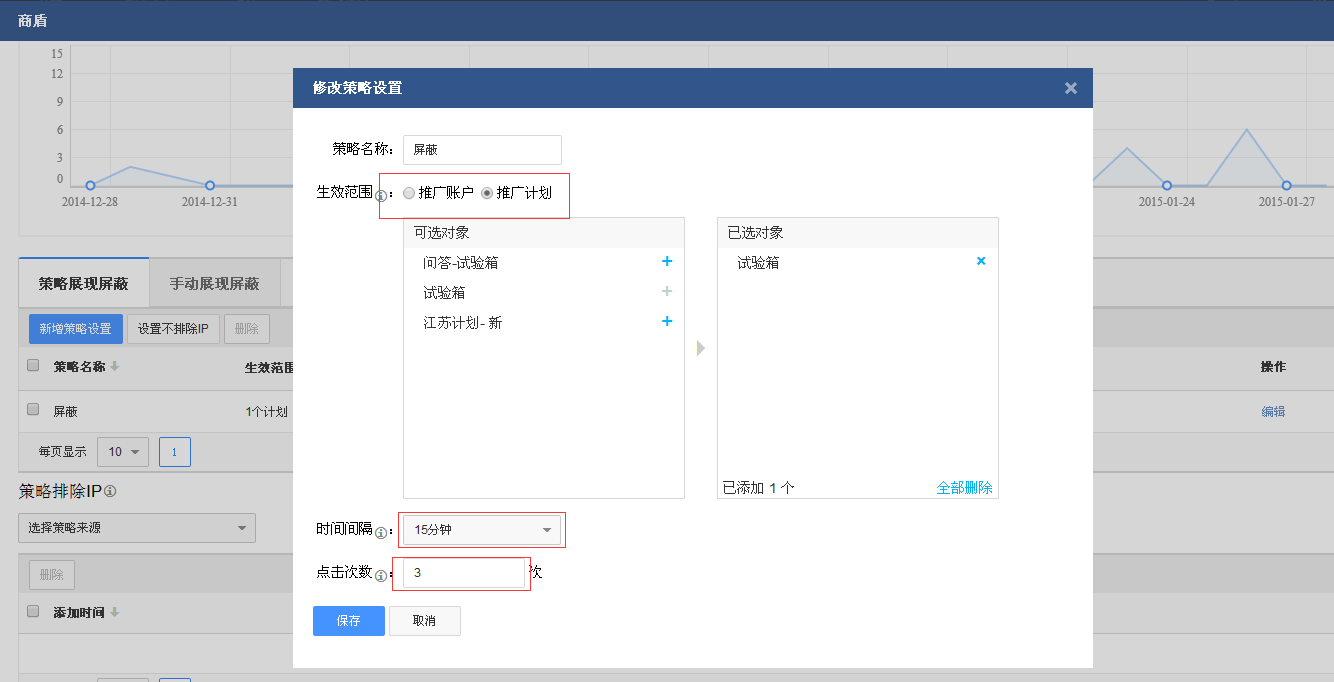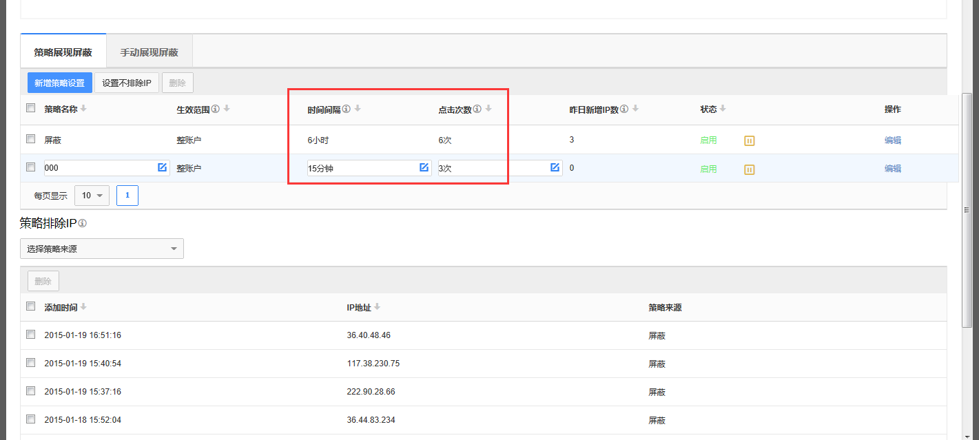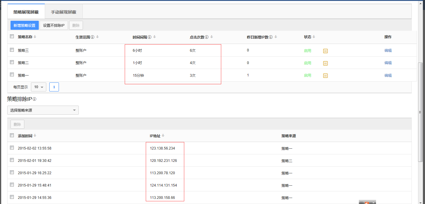 第二,帮客户进行策略展现屏蔽排除方法。在日常维护中也会遇到客户询问,如果同一个ip地址连续访问我的推广结果,会不会多次扣费呢?针对这个问题,现在可以运用策略展现屏蔽功能解决,根据客户的需求可以具体的根据账户或者计划层,通过时间间隔和点击次数来设置(时间间隔是15分钟/1小时/6小时),因该客户关键词平均单价都比较高,在五十以上,我建议客户时间间隔选择15分钟,点击次数在3次。并告知客户如果有符合这个要求的ip的话,就会在策略排除ip中。