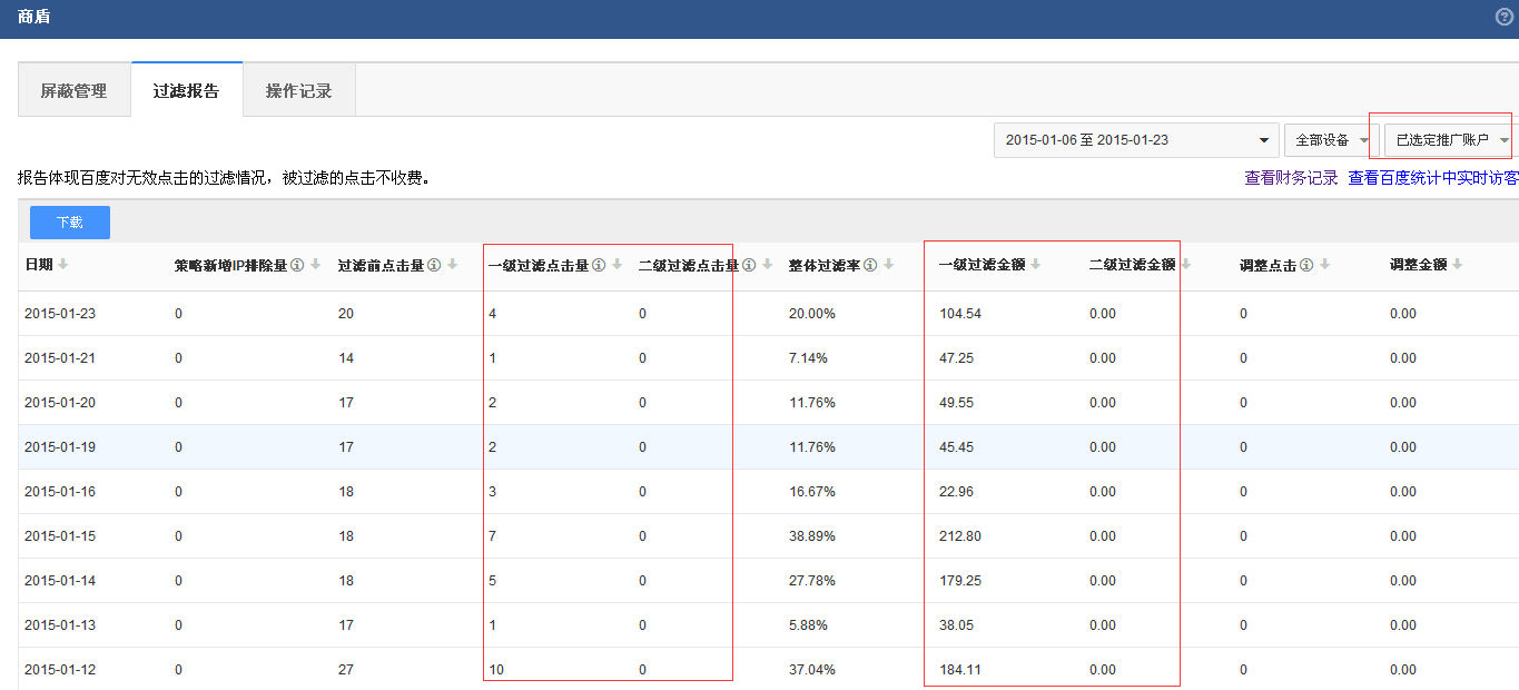 一、商盾产生之前:IP屏蔽局限性太大。虽然监控到有无效点击,但账户只能屏蔽30个IP,计划只能屏蔽20个IP,且账户IP无法批量管理,计划IP也得逐个查看添加,费时费力,屏蔽也不够彻底。如下图:219.72.202.61这一IP接连点客户几次广告,我们只能通过查看百度统计,手动进行排除,但由于屏蔽数量局限性太大,明知道是客户恶意点击,却无位置将该IP进行屏蔽。