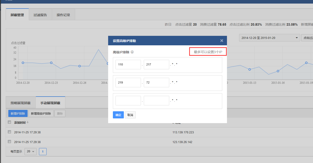 第一,针对客户平时自己用统计软件监控的ip数据,让客户那边每天关注好数据,如有发现同一ip多次访问的,让客户整理好ip地址,在推广后台“工具中心”的“商盾”中选择“手动展现屏蔽”,里面数量全新升级,从20个增加至200个ip排除,同时还可以设置三个高级ip排除,因高级ip屏蔽的范围更广,建议客户谨慎使用这个。