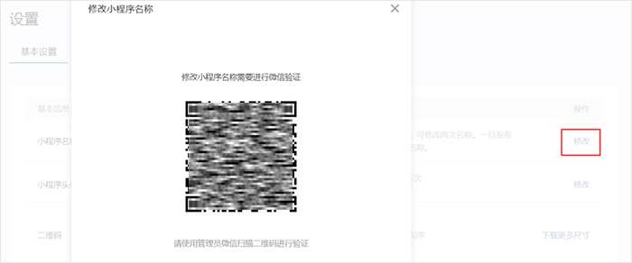 修改方法:登录【微信公众平台小程序】-> 【设置】->【基本信息】->【小程序名称】->【修改】->通过管理员扫码验证后即可进入修改页面,当修改名称命中保护词的时候,需要进一步审核通过方可修改成功,名称修改成功后,原名称会立即释放。
