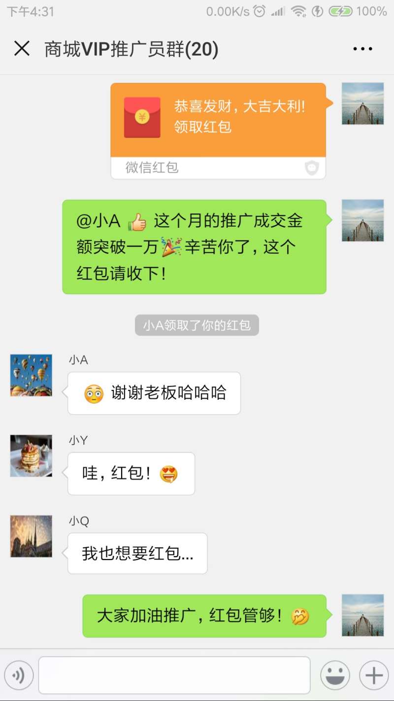 3. 给予奖励/优惠刺激:针对买家/会员微信群,商家可以通过现金奖励,刺激买家/会员成为推广员,例如对新晋的推广员,首次成功推广订单,除了能在商城中获得推广奖励,更可额外获得一定金额的微信红包,或是同等价值的商城产品。针对推广员微信群,商家可对每月成交金额最高的推广员奖励一定金额的现金红包,或是在群里不定时发布新品限时折扣、秒杀活动,以此刺激推广员更卖力为商家推广产品。