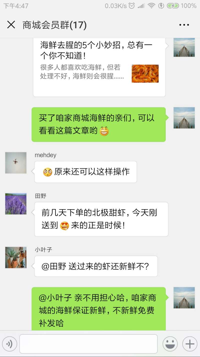 2. 保持社群活跃度:商家可以通过制造话题,引导群成员进行讨论,进而保持社群活跃度。话题选择尽量贴合商城所卖产品,例如生鲜蔬果的商家可以定期转发类似《海鲜的去腥方法》《水果这样搭配吃才养生》的文章到群内,引发讨论。