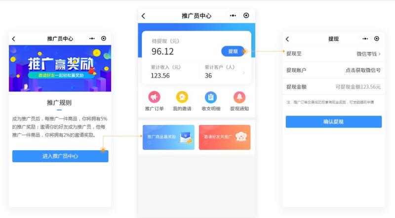 推广员功能的内核是二级裂变分销,可无限邀请下级,推广员在成功推广产品后可获得现金奖励,只要你的产品够给力,佣金比率吸引,自然能够吸纳众多客户自发推广,线上商城的渠道由此拓开。