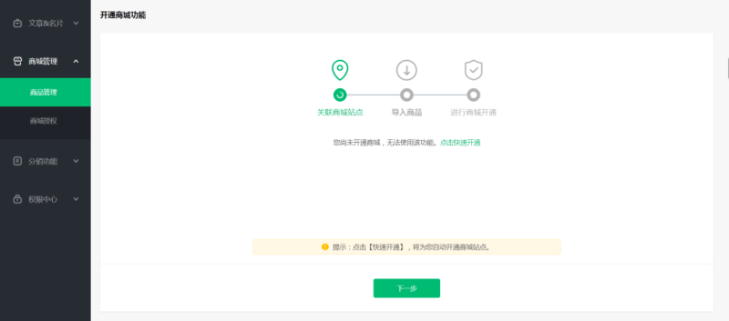 登陆销售系统PC端,点击侧边栏中的【商城管理】,进入商城开通流程,并根据步骤指示关联商城站点、授权商城小程序、导入商品,即可开通商城。